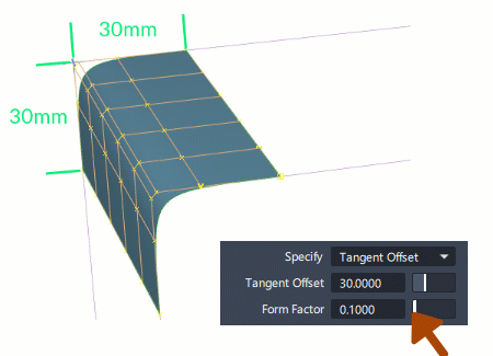 Form Factor は、G1 Tangent または G2/G3 Curvature を選択したときのフィレットまたはブレンドの形状をコントロールします。