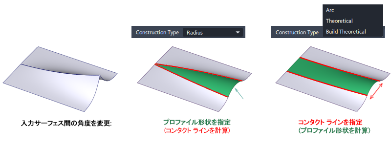 Construction Type を Radius に設定した状態で、プロファイル シェイプを Radius 値で指定します(非円形フィレットの場合は Center Radius / Tangent Length の値で指定します)。コンタクト ラインは、サーフェス フィレット ツールによって計算されます。