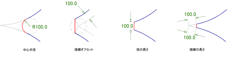 このオプションは、Construction Type で Arc (Chord)、Existing Theoretical、または Build Theoretical を使用してフィレット幅を指定した場合に表示されます。これらの Construction Type では、半径値を明示的に設定できません。