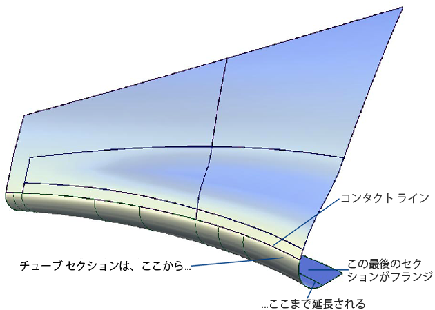G2 Curvature 連続性を持つチューブを作成する場合、チューブは 360 度のセクションを失い、コンタクト ラインとフランジの間に作成されます。
