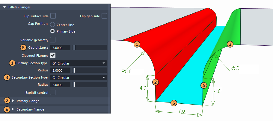 プライマリ/セカンダリ フィレットおよびフランジが構築されます。パネル サーフェスはフィレットのエッジに自動的にトリミングされ、ギャップが作成されます。