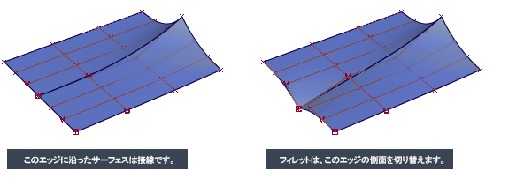 エッジで交わるサーフェスがいずれかの点で互いに接している場合、または丸めたときに側面が切り替わる場合、フィレットは失敗します。