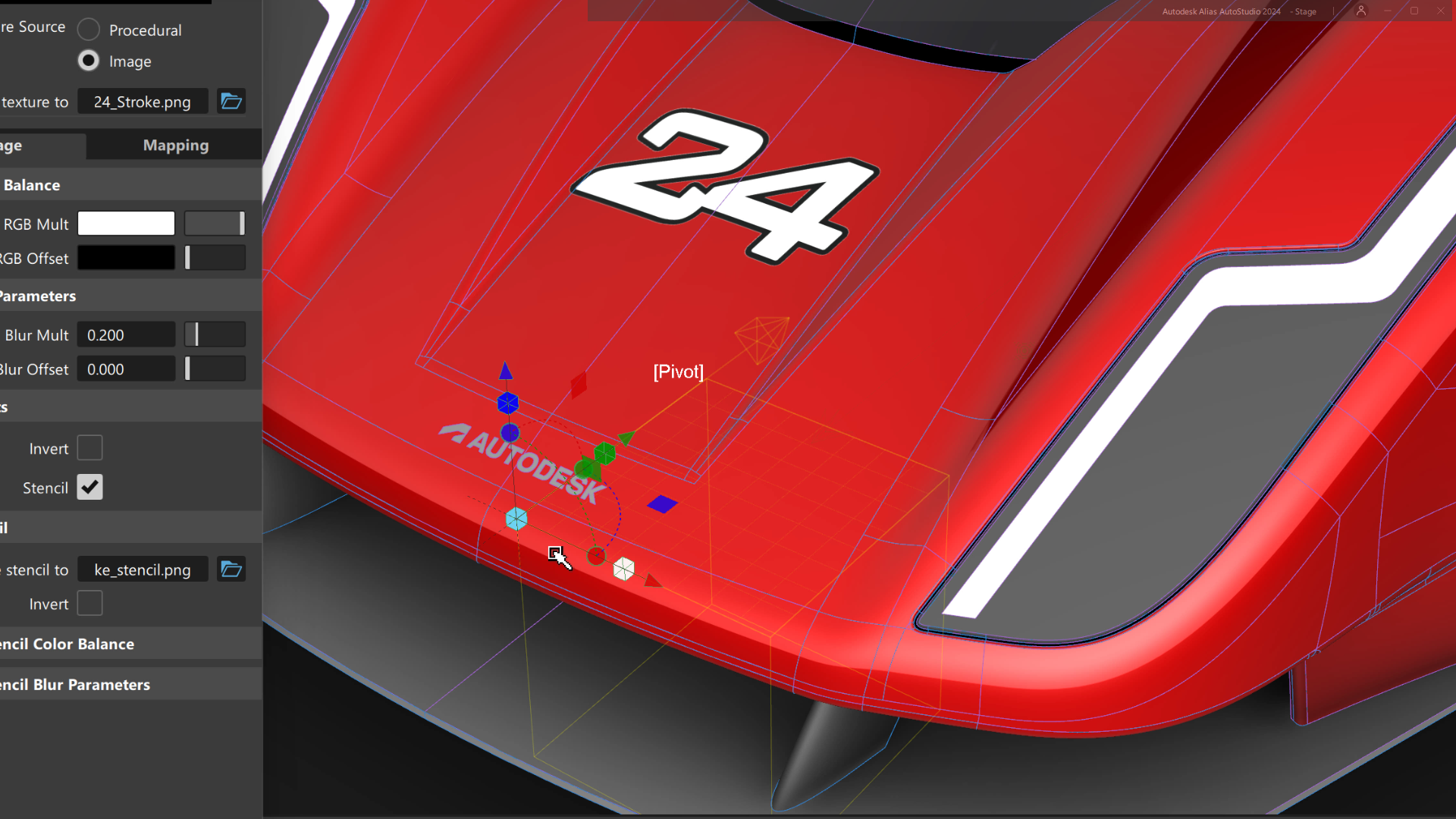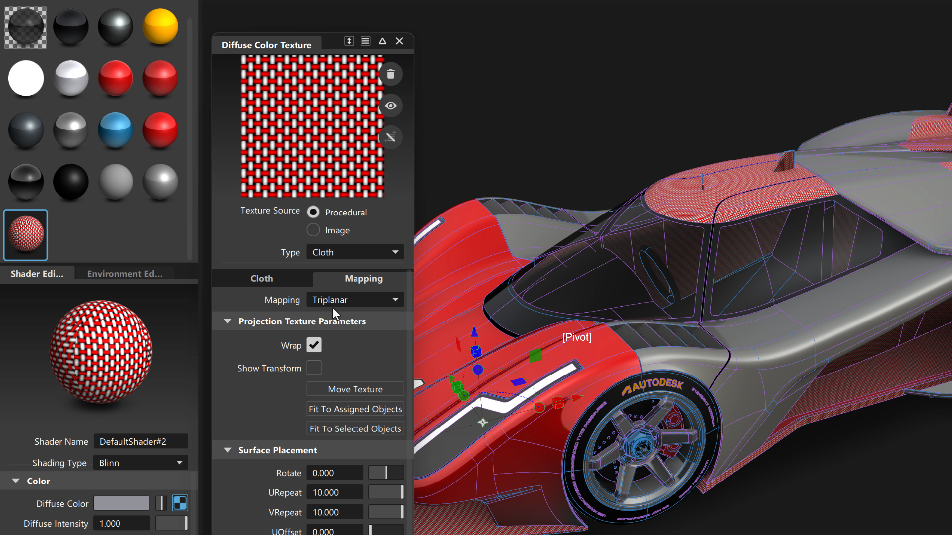 シーンに環境を追加し、シェーダ ライブラリからプリセット シェーダを割り当てます。モデルにデカールを追加できるよう、テクスチャを作成します。トランスフォーム マニピュレータを使用してテクスチャを配置およびスケールします。