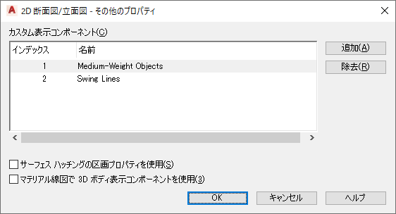 2D 立面図の線図でマテリアルの 3D ボディ表示コンポーネントを使用するかどうかを指定するには、次の操作を実行します。