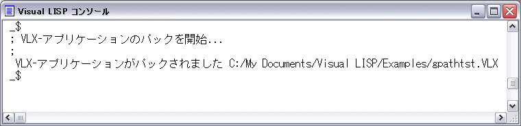 Visual LISP の[コンソール]ウィンドウには、アプリケーション実行ファイルである .vlx ファイルの作成に関するメッセージが表示されます。[アプリケーションを作成]プロセスが成功すると、[コンソール]ウィンドウには、次の例のように、.vlxのフォルダ パスとファイル名が表示されます。