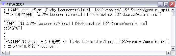 このプロセスからの出力メッセージは、[出力作成]ウィンドウと[コンソール]ウィンドウの 2 つの Visual LISP ウィンドウに表示されます。[作成出力]ウィンドウには、.fas ファイルへの AutoLISP ソース コードのコンパイルに関するメッセージが表示されます。コンパイルが成功したときは、次のように出力されます。
