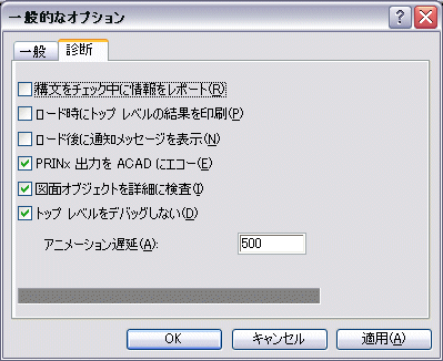 Visual LISP の[ツール]メニューの[環境オプション]サブメニューから[一般的なオプション]オプションを選択すると、[一般的なオプション]ダイアログ ボックスが表示されます。[一般的なオプション]ダイアログ ボックスの[診断]タブには、Visual LISP が AutoLISP の構文に関する情報を通知する方法をコントロールするオプションがあります。