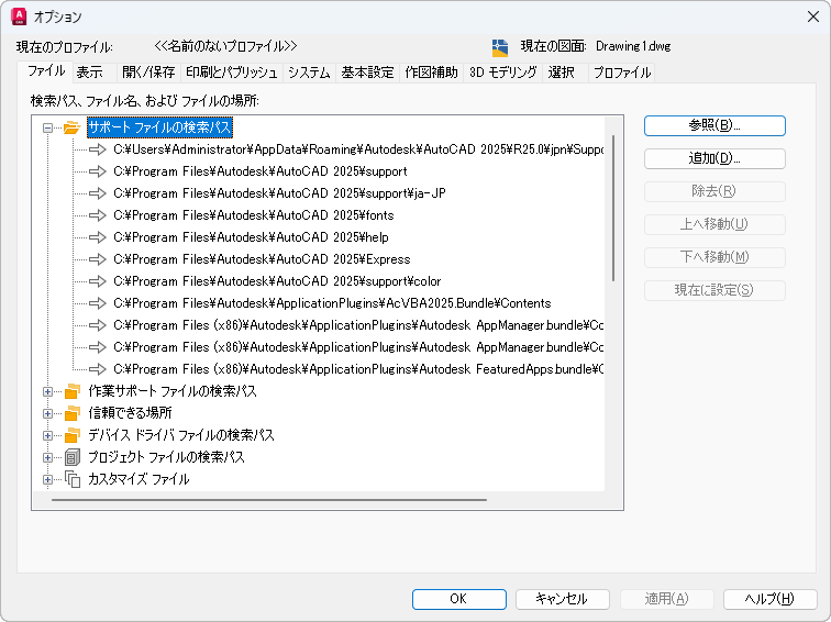 ソース ファイルが AutoCAD のサポート ファイル検索パスにある場合は、ファイル名を指定するとき、パス名を省略できます。検索パスを設定するには、AutoCAD のアプリケーション メニュー