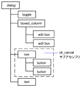 たとえば、[OK]、[キャンセル]、[ヘルプ]ボタンは、サブアセンブリにグループ化されており、3 つのボタン タイルの行(クラスタ)と各ボタンを区切るいくつかのスペースで定義されています。サブアセンブリは、1 つのタイルとして扱われます。サブアセンブリ内のタイルを、子といいます。DCL ファイルは、ツリー構造になっています。ツリーの一番上には、ダイアログ ボックス自体を定義する(dialog)タイルがあります。次の図に、DCL ファイルの構造を示します。
