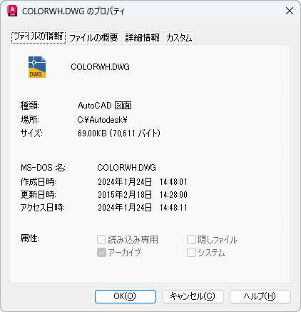 図面ファイルに関する読み込み専用の情報が表示されます。このデータは、オペレーティング システムから取得されます。