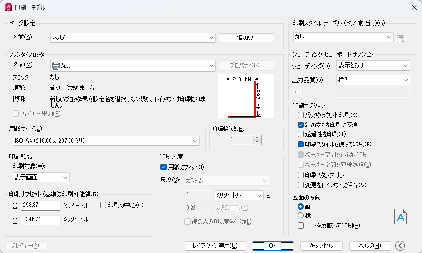 出力単位に対する作図単位の相対的なサイズをコントロールします。レイアウトを印刷するときの既定の尺度は 1:1 です。[モデル]タブから印刷するときは、既定の設定は[用紙にフィット]になります。