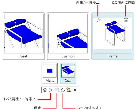 ショットを作成すると、各ショットまたはショット シーケンスのサムネイル上の表示コントロール、または ShowMotion コントロールを使用して、ショットに割り当てられたアニメーションを再生することができます。使用可能な表示コントロールは、次のとおりです。