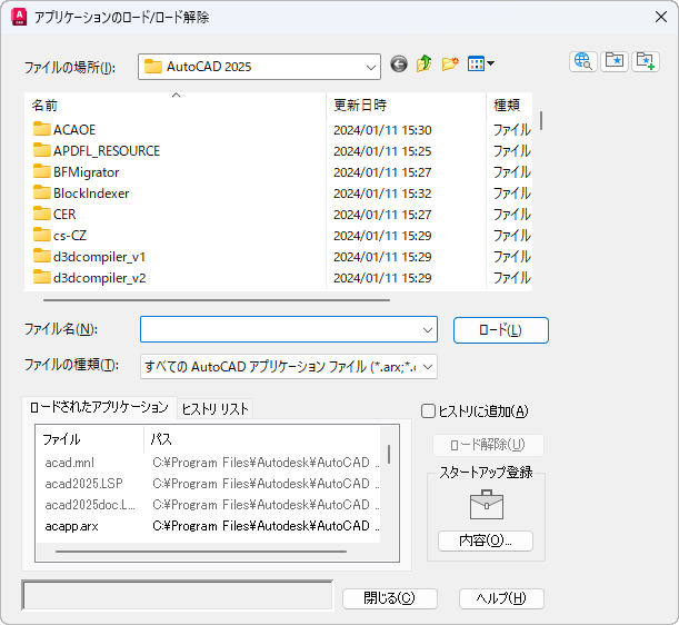 現在ロードされているアプリケーションが、(ファイル名によって)アルファベット順にリストされます。LISP ルーチンは、[アプリケーションのロード/ロード解除]ダイアログ ボックスを使用してロードしている場合にのみ、このリストに表示されます。