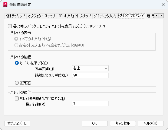 オブジェクトを選択したときに、選択したオブジェクトに従ってクイック プロパティ パレットを表示します。(システム変数 QPMODE)