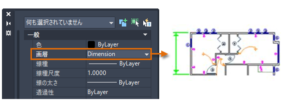 図面で 現在のプロパティを指定すると、新しく作成されるすべてのオブジェクトでこれらの設定が自動的に使用されます。たとえば、 現在の画層を寸法に設定すると、作成するオブジェクトは寸法画層に作成されます。