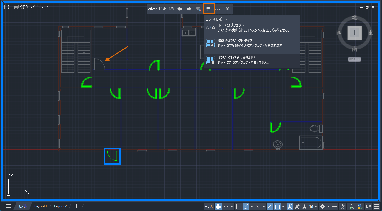 レビュー モードでは、[検出]ツールバーが図面ウィンドウの上部に表示されます。このツールバーには、検出結果のナビゲートおよび管理に関する各種オプションがあります。検出結果は、類似オブジェクトのセットにグループ化されます。「セット」は、検出された類似オブジェクトのグループを表すもので、単一ブロックのインスタンスに変換できます。