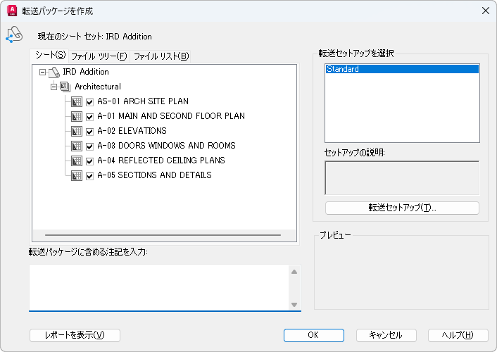 このタブを使用して、シート セット、シート サブセットまたはシートから転送パッケージを作成できます。[シート セット マネージャ]パレットでシート セットを開き、シート セット、シート サブセット、またはシート ノードを右クリックして表示されるショートカット メニューから[e-トランスミット]を選択してください。