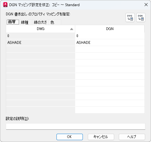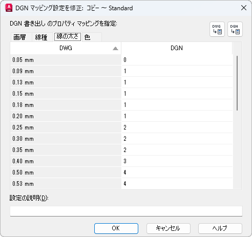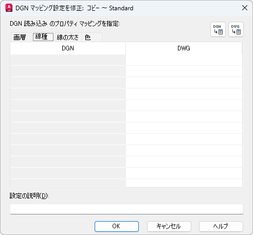 マッピング設定を書き出す: [DGN 書き出し設定]ダイアログ ボックスから新しい設定を作成して[DGN マッピング設定を修正]ダイアログ ボックスにアクセスすると、[DWG]列には、現在の図面ファイル内で定義されているすべての線種が一覧表示されます。目的のセル(右側の列)が空白の場合は、常に既定のシステム マッピングが使用されます。