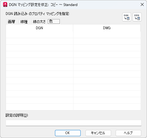 既存のマッピング設定: 既存のマッピング設定を編集している場合([DGN 読み込み設定]または[DGN 書き出し設定]ダイアログ ボックスを使用して Standard 以外の設定を編集している場合であっても)、マッピング テーブルに一覧表示されるプロパティは、読み込まれる DGN ファイルまたは書き出される図面ファイルから取得されません。