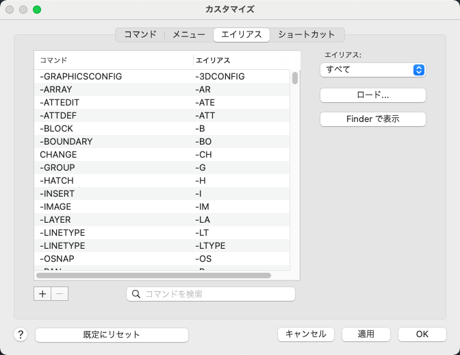 注: コマンド エイリアスへの変更は、acaduser.pgp ファイル(AutoCAD LT の場合は acadltuser.pgp)に保存されます。