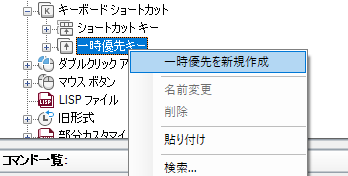 - [カスタマイズ]タブの[ <ファイル名> 内のカスタマイズ]ペインで、[キーボード ショートカット]ノードの横のプラス(+)記号をクリックして展開します。