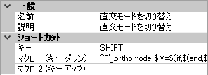 - [マクロ 2 (キー アップ)]ボックスに、一時優先キーを放したときに実行されるマクロを入力します。値を定義しない場合、キー アップすると、アプリケーションと図面の設定は前の状態(一時優先が実行される前の状態)に復元されます。