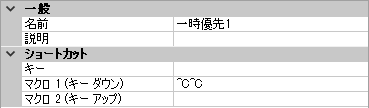 - [マクロ 2 (キー アップ)]ボックスに、一時優先キーを放したときに実行されるマクロを入力します。値を定義しない場合、キー アップすると、アプリケーションは前の状態(一時優先が実行される前の状態)に復元されます。