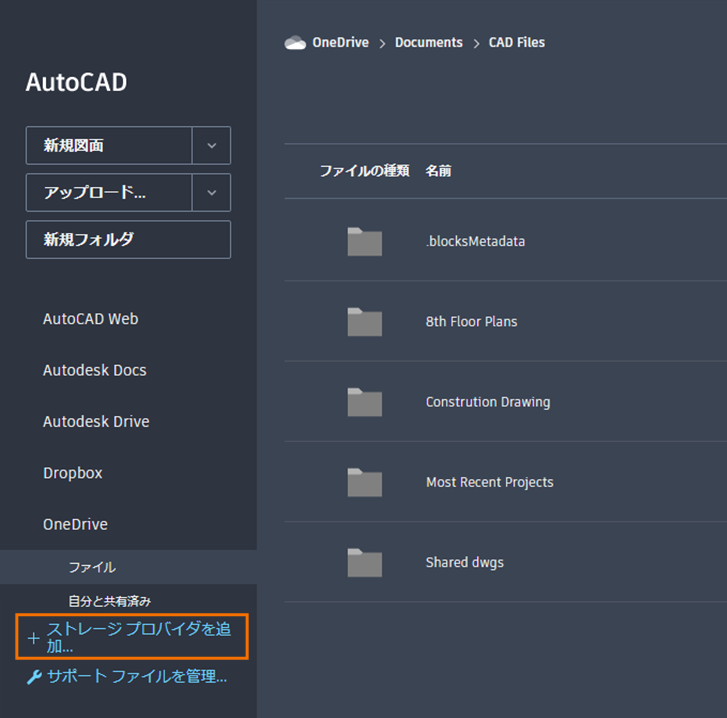 注: AutoCAD Web およびモバイル アプリは、次のストレージ プロバイダのいずれかに接続できます。