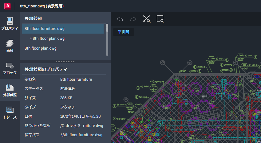 表示専用の図面には「表示のみ」というラベルが表示され、保存、印刷、作図ツールが無効になります。図面に編集および保存権限を付けて共有した場合、ユーザが図面を指定した場所に保存すると、図面にアタッチされているすべての参照がその同じ場所に保存されます。