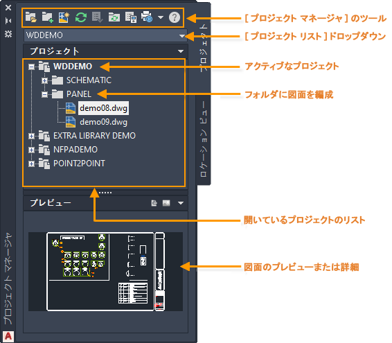 AutoCAD Electrical ツールセット はプロジェクトベースです。プロジェクトとは、相互に関連性を持つ図面のセットです。プロジェクトに含まれている図面など、プロジェクト関連のすべての情報は、拡張子 .wdp の付いたプロジェクト ファイルに保存されます。