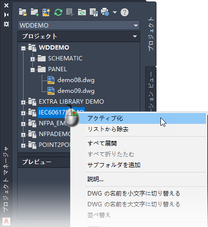 プロジェクト設定としてプロジェクト ファイルに保存されるプロパティ。これらのプロパティには、対応する図面プロパティがなく、プロジェクト全体の機能をコントロールします。 プロジェクトをアクティブ化するには、複数の方法があります。