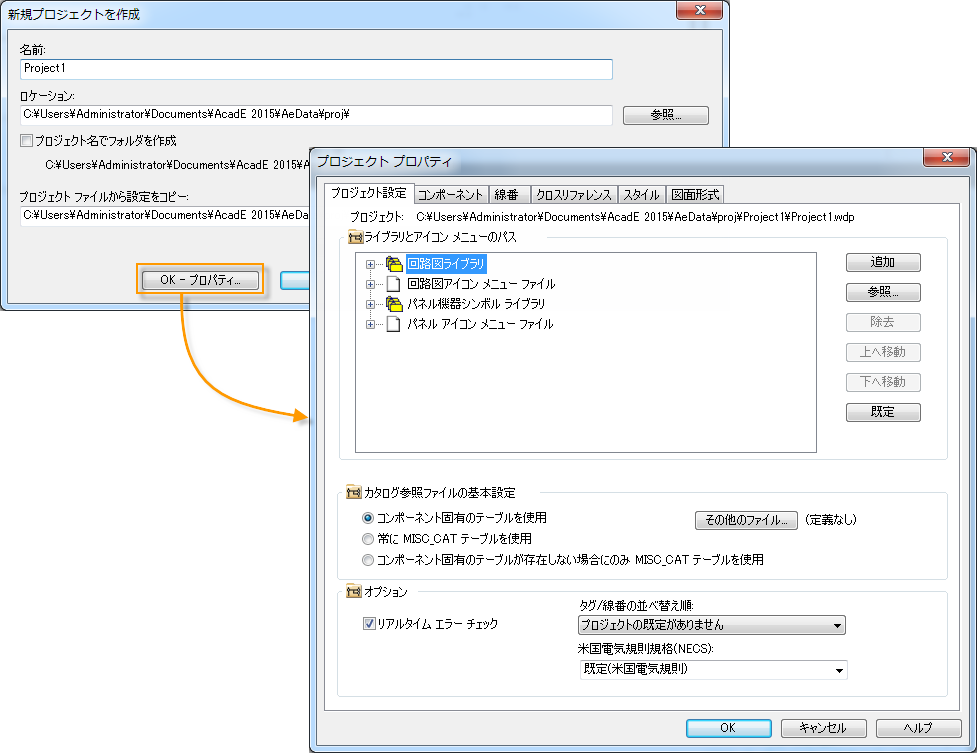 新規プロジェクトの開始時または作業開始後の任意の時点で、ライブラリ パス、図面形式、リファレンスのスタイルなどのプロジェクト プロパティを定義することができます。