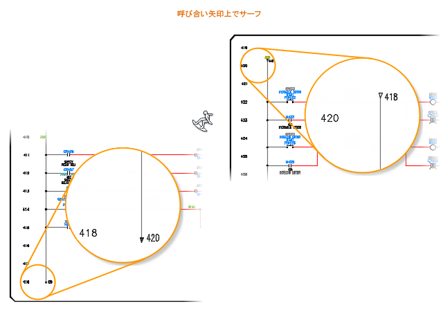 クロスリファレンス情報は呼び合い矢印にも追加されます。発側矢印には、その着側矢印のそれぞれのリファレンス位置が注釈として付加されます。着側矢印には、その発側矢印のリファレンス値が注釈として追加されます。