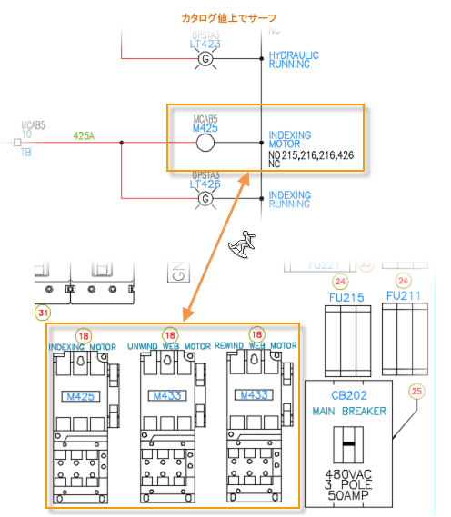 AutoCAD Electrical ツールセット により、リファレンス位置を示す関連する回路図コンポーネントにクロスリファレンス情報が追加されます。親コンポーネントには、その子のそれぞれのリファレンス値が注釈として追加されます。子コンポーネントには、その親のリファレンス値が注釈として追加されます。
