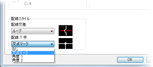 配線が別の配線で終了し、T 字接続を形成する場合、[図面プロパティ]ダイアログ ボックスの[スタイル]タブで定義した交点マークまたは角度付きティー マーカーが割り当てられます。