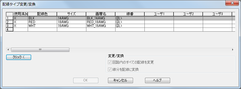 画層を変更して、配線画層でないようにするには、行をクリックし、[画層を除去]をクリックします。画層自体は図面に存在しますが、この画層上に描画した線分は配線と見なされなくなります。