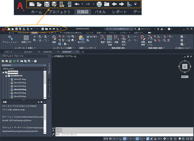 このガイドに記載されているすべての機能には、リボンからアクセスできます。また、次に示すクイック アクセス ツールバーにも、AutoCAD Electrical ツールセット で使用する一部のナビゲーション コマンドが表示されます。