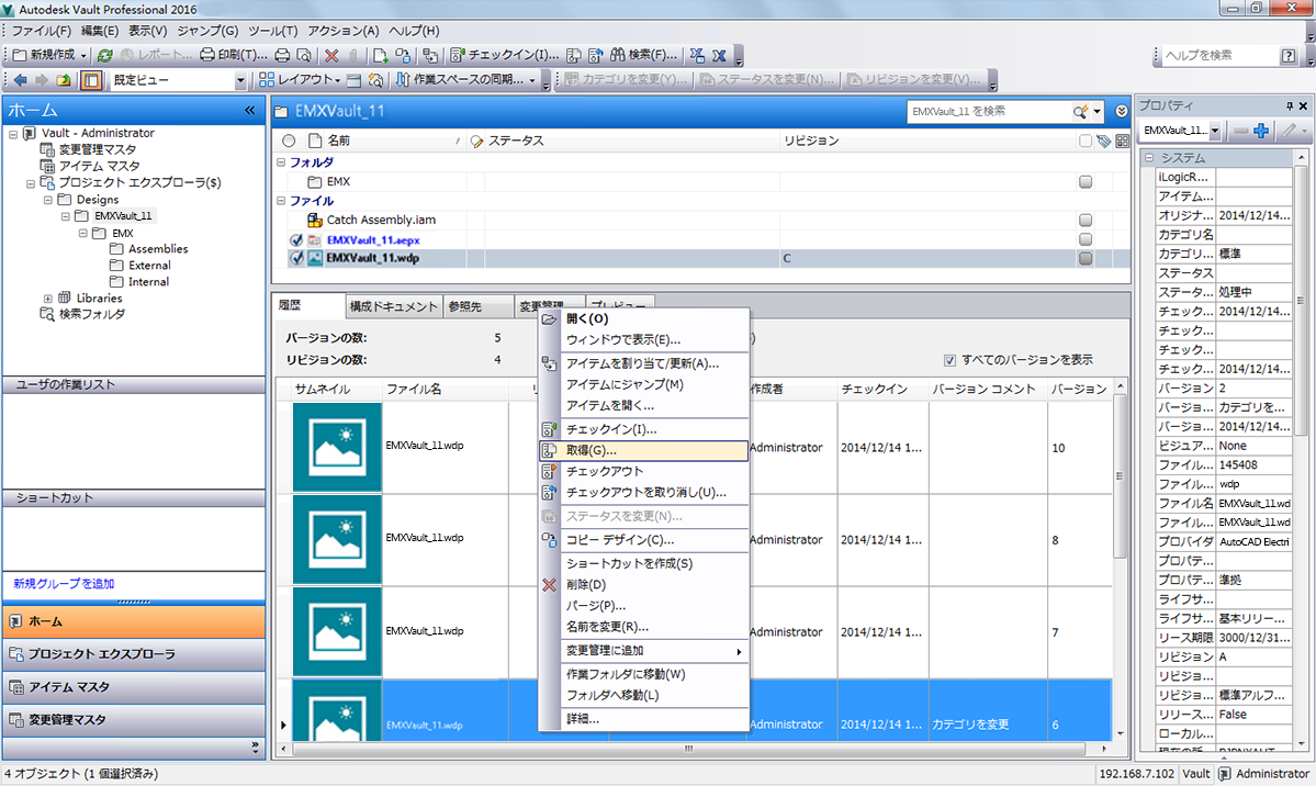 Autodesk Vault Explorer を使用すると、エレメカ ファイルを前のバージョンにロールバックすることができます。