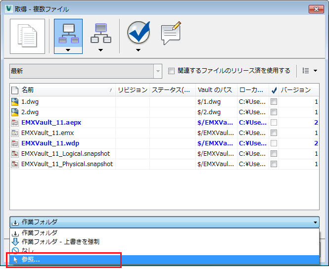 - Vault と連携して作業している AutoCAD Electrical ツールセット ユーザの場合、.wdp プロジェクト ファイルについて、[すべてチェックアウト]または[すべてチェックイン]を使用して、プロジェクトとプロジェクト内の図面ファイルとの間でバージョンの矛盾が発生しないようにする必要があります。