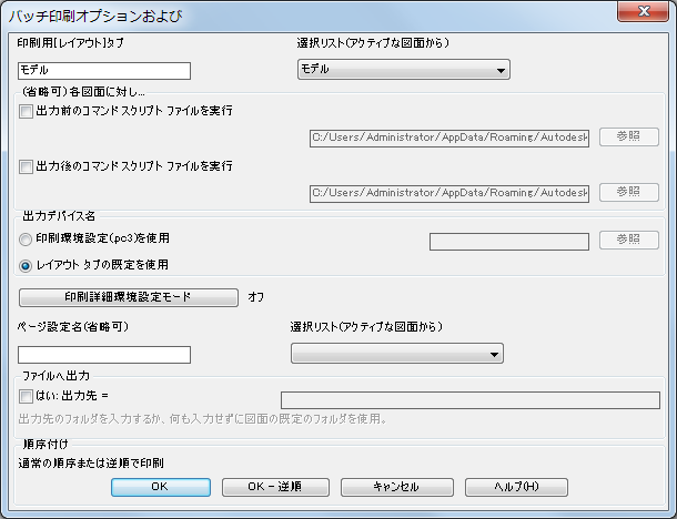 選択した図面について、印刷するレイアウトを選択します。ページ設定を定義した場合は、名前を入力します。