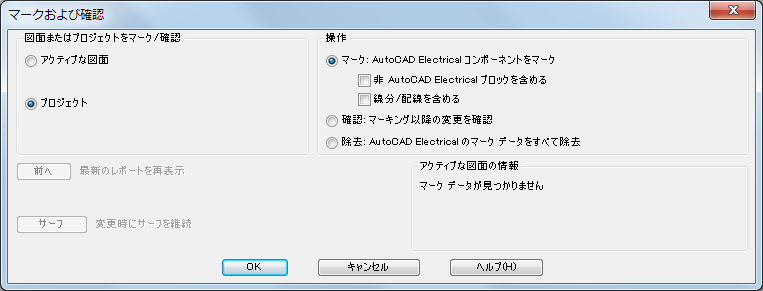 このコマンドでは、AutoCAD Electrical ツールセット 以外で行った変更も追跡することができます。[マーク]オプションを使用して、開始点を作成します。非表示の情報が各図面および各コンポーネントに追加されます。AutoCAD Electrical ツールセット