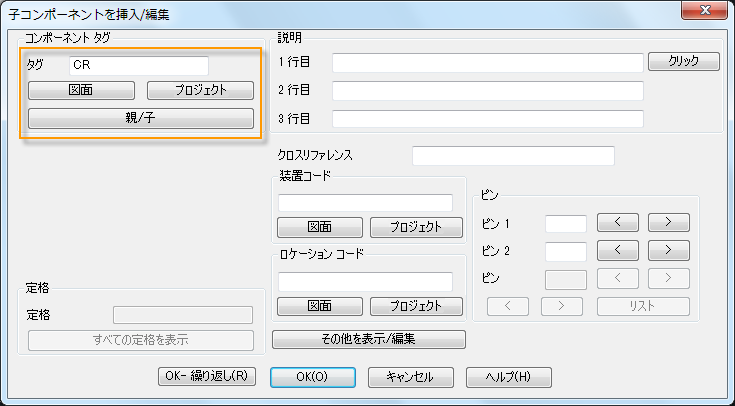 親を選択すると、装置、ロケーション、説明など、親の他の値とともに、同じタグ値が子に割り当てられます。子に同じタグが割り当てられると、同じ機器に子が属していると AutoCAD Electrical ツールセット で認識されます。