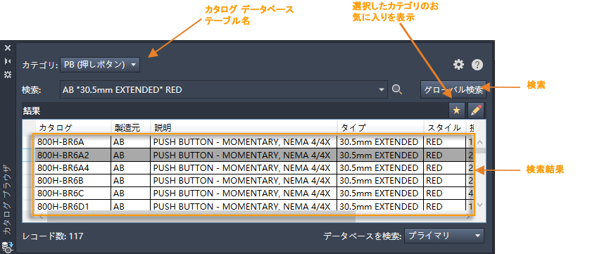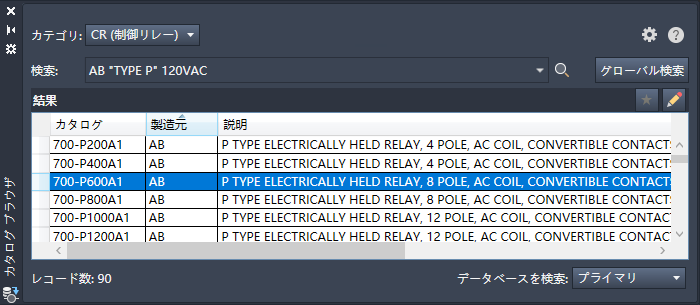 プロジェクトのコンポーネント リストで作業を開始し、パーツ番号を既に把握している場合は、カタログ データベースからコンポーネントを選択して挿入することができます。カタログ データベースからコンポーネントを挿入するには、[カタログ ブラウザ]パレットを使用します。 検索