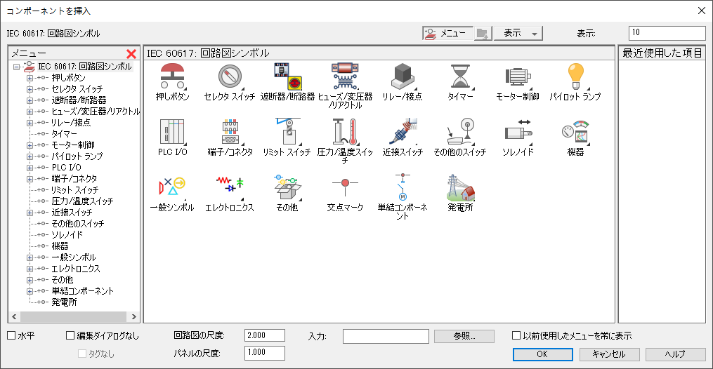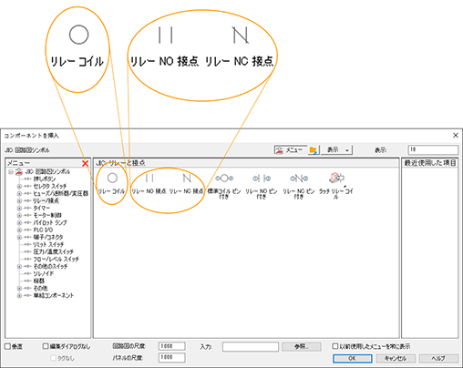 アイコン メニューでは、NO 押しボタンや 3 ポジション セレクタ スイッチなど、シンボル タイプを選択して、シンボルを挿入できます。シンボルを挿入すると、説明やカタログ情報などの注釈をシンボルに付けることができます。