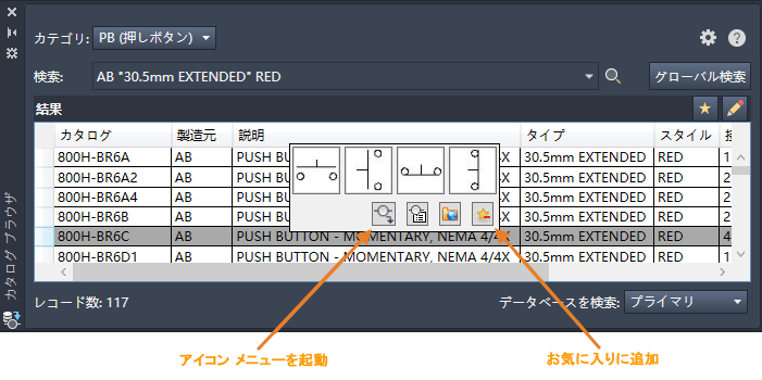 必要なシンボルがカタログ番号に関連付けられていない場合は、[カタログ ブラウザ]からアイコン メニューを直接開いて挿入することができます。シンボルの挿入時に、該当するカタログ番号にシンボルが関連付けられます。頻繁に使用するカタログ値は、お気に入りに追加します。