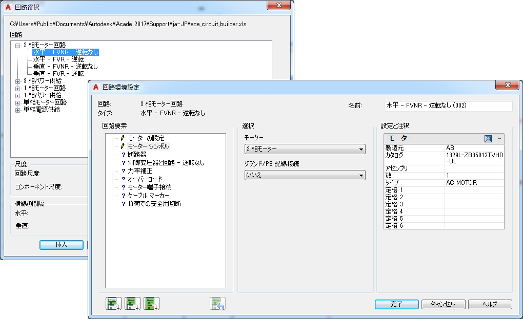 モーター制御回路および給電回路を挿入するには、回路ビルダを使用します。各種の回路オプションの中からオプションを選択します。 検索