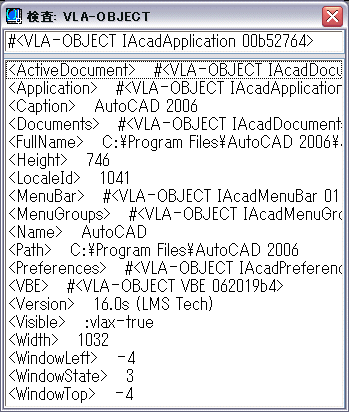 (vlax-dump-object (vlax-get-acad-object)) ; IAcadApplication: An instance of the AutoCAD application ; Property values: ; ActiveDocument = #<VLA-OBJECT IAcadDocument 000002569b4802d8> ; Application (RO) = #<VLA-OBJECT IAcadApplication 00007ff78ec15be0> ; Caption (RO) = "Autodesk AutoCAD 2025 - [Drawing1.dwg]" ; Documents (RO) = #<VLA-OBJECT IAcadDocuments 00000256aab93c70> ; FullName (RO) = "C:\\Program Files\\Autodesk\\AutoCAD 2025\\acad.exe" ; Height = 1040 ; HWND (RO) = 595288 ; LocaleId (RO) = 1033 ; MenuBar (RO) = #<VLA-OBJECT IAcadMenuBar 00000256aab94248> ; MenuGroups (RO) = #<VLA-OBJECT IAcadMenuGroups 00000256fcb1fea8> ; Name (RO) = "AutoCAD" ; Path (RO) = "C:\\Program Files\\Autodesk\\AutoCAD 2025" ; Preferences (RO) = #<VLA-OBJECT IAcadPreferences 00000256aac5b2e8> ; Initializing VBA System...StatusId (RO) = ...Indexed contents not shown... ; VBE (RO) = #<VLA-OBJECT VBE 00000256ce7ac5f8> ; Version (RO) = "25.0s (LMS Tech)" ; Visible = -1 ; Width = 1916 ; WindowLeft = 2 ; WindowState = 1 ; WindowTop = 0 T