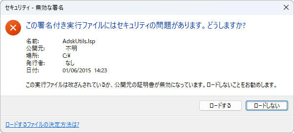デジタル署名されているカスタム プログラム ファイルをロードすると、AutoCAD ベースのプログラムまたは AutoCAD LT によって、ファイルにアタッチされたデジタル署名が確認されます。デジタル署名が確認できたかどうかのメッセージ ボックスが表示されて、作図環境へのプログラム ファイルのロードが許可されたり、許可されなかったりします。