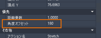 - [プロパティ]パレットで[角度オフセット]を 180 に設定します。これにより、直線状グリップをドラッグすると、選択したオブジェクトが反対方向にストレッチされるようになります。