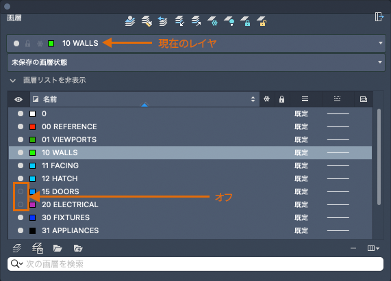次に示すのは、[画層プロパティ管理]の最も一般的に使用される画層の設定です。設定のオン/オフを切り替えるには、アイコンをクリックします。